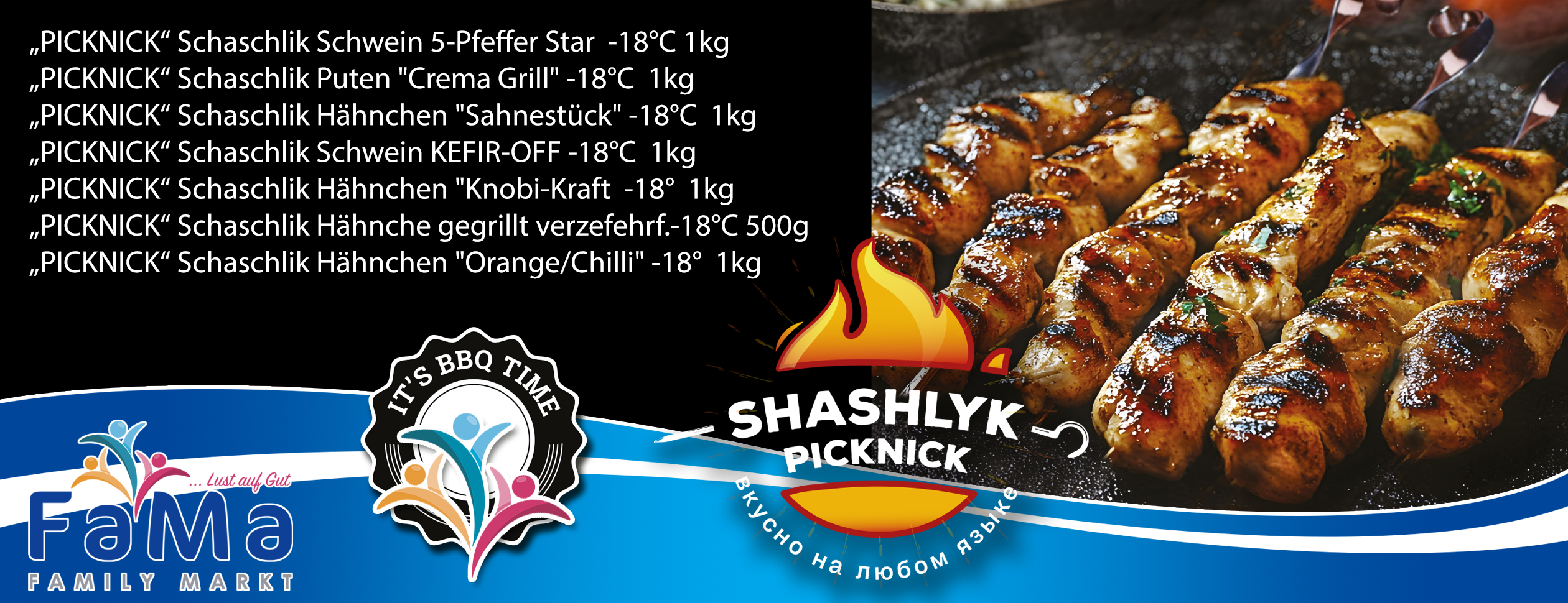 PICKNICK Schaschlik Puten "Crema Grill" -18°C 1kg Zutaten:Putenfleisch 80%, Trinkwasser, Marinade: Sonnenblumenöl, Salz, Glukose, Molkepulver, Dill, grüne Zwiebel, Knoblauch, Zucker, Fruktose, Hefe-Extrakt, Petersilie, Oregano, Laktose, Säureregulatoren (E330, E260)), Farbstoffe (E150c, E100, E160c, E141), Aromen. Es können Spuren von Nüssen, Sesam, Milch, Sellerie und Ei vorkommen. Zubereitung: langsam im Kühlschrank auftauen lassen, aufspießen und über gewünschter Grillstelle grillen.