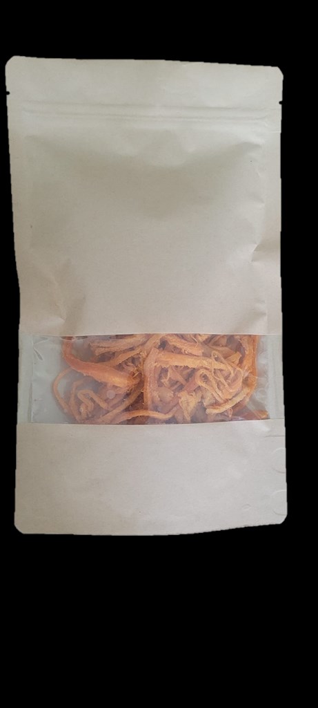 Zutaten: Tintenfisch 3% (Neocoleoidea), Salz, Zucker, Paprika edelsüß 0,3%, Paprika scharf 0,1%, Sesam 0,1%, Geschmacksverstärker (E621), Feuchthaltemittel: Sorbit (E420), Konservierungsstoff: Kaliumsorbat (E202). Fanggebiet: Südostpazifik FAO 87. Fangmethode: Schleppnetze, Umschließungsnetze. Herkunft: China. Abgepackt in der EU. Das Produkt ist für den sofortigen Verzehr geeignet.