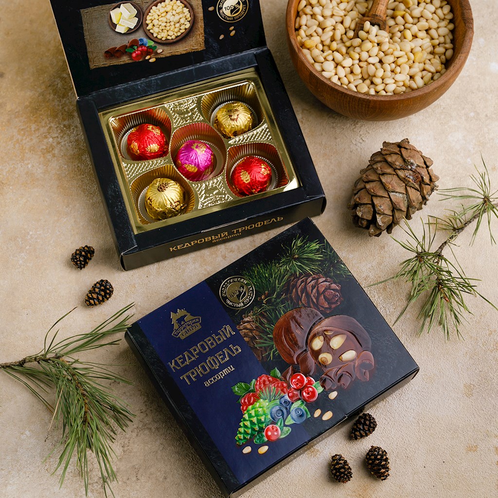 (klassisch, mit Preiselbeeren, Himbeeren, Blaubeeren, Tannenzapfen). Zutaten:– Klassischer Trüffel: dunkle Schokolade (Kakaomasse, Zucker, Kakaobutter, Emulgator Sojalecithin, Aroma), Butter, Pinienkerne, Kondensmilch, Zucker, Cognac. Trüffel mit Preiselbeeren: dunkle Schokolade (Kakaomasse, Zucker, Kakaobutter, Emulgator Sojalecithin, Aroma), Butter, Pinienkernkerne, gefriergetrocknete Preiselbeeren, Kondensmilch, Zucker, Cognac. Trüffel mit Himbeeren: dunkle Schokolade (Kakaomasse, Zucker, Kakaobutter, Emulgator Sojalecithin, Aroma), Butter, Pinienkernkerne, gefriergetrocknete Himbeeren, Kondensmilch, Zucker, Cognac. Trüffel mit Blaubeeren: dunkle Schokolade (Kakaomasse, Zucker, Kakaobutter, Emulgator Sojalecithin, Aroma), Butter, Pinienkernkerne, gefriergetrocknete Blaubeeren, Kondensmilch, Zucker, Cognac. Trüffel mit Tannenzapfen: dunkle Schokolade (Kakaomasse, Zucker, Kakaobutter, Emulgator Sojalecithin, Aroma), Butter, Pinienkerne, kondierte Tannenzapfen, Kondensmilch, Zucker, Cognac. Trocken und lichtgeschützt lagern. Hergestellt in Russland.