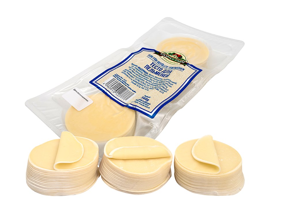 Family Farm Teig für Teigtaschen Pelmeni 360g Zutaten: Hartweizenmehl, Wasser, Maisstärke, Salz, Sonnenblumenöl. Zubereitung: Ungeöffnete Packung langsam auftauen lassen bis Zimmertemperatur. Hergestellt in Russland. Durchschn. Nährwerte je 100g: Brennwert 1055 kj/252 kcal, Fett 1,3 g, davon gesättigte Fettsäuren 0,3 g; Kohlenhydrate 52 g, davon Zucker 0,4 g, Eiweiß 8 g, Salz 0,4 g.