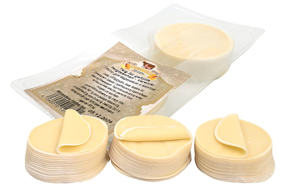 - Family Farm Teig für Teigtaschen Vareniki 400g Zutaten: Hartweizenmehl, Wasser, Maisstärke, Salz, Sonnenblumenöl. Zubereitung: Ungeöffnete Packung langsam auftauen lassen bis Zimmertemperatur. Teigschnitte aus der Packung nehmen, den Rand mit Wasser befeuchten, gewünschte Füllung dazugeben und verschließen . Durchschn. Nährwerte je 100g: Brennwert 1042 kj/249 kcal, Fett 1 g, davon gesättigte Fettsäuren 0,2 g; Kohlenhydrate 52 g, davon Zucker 2,5 g, Eiweiß 8 g, Salz 0,6 g.