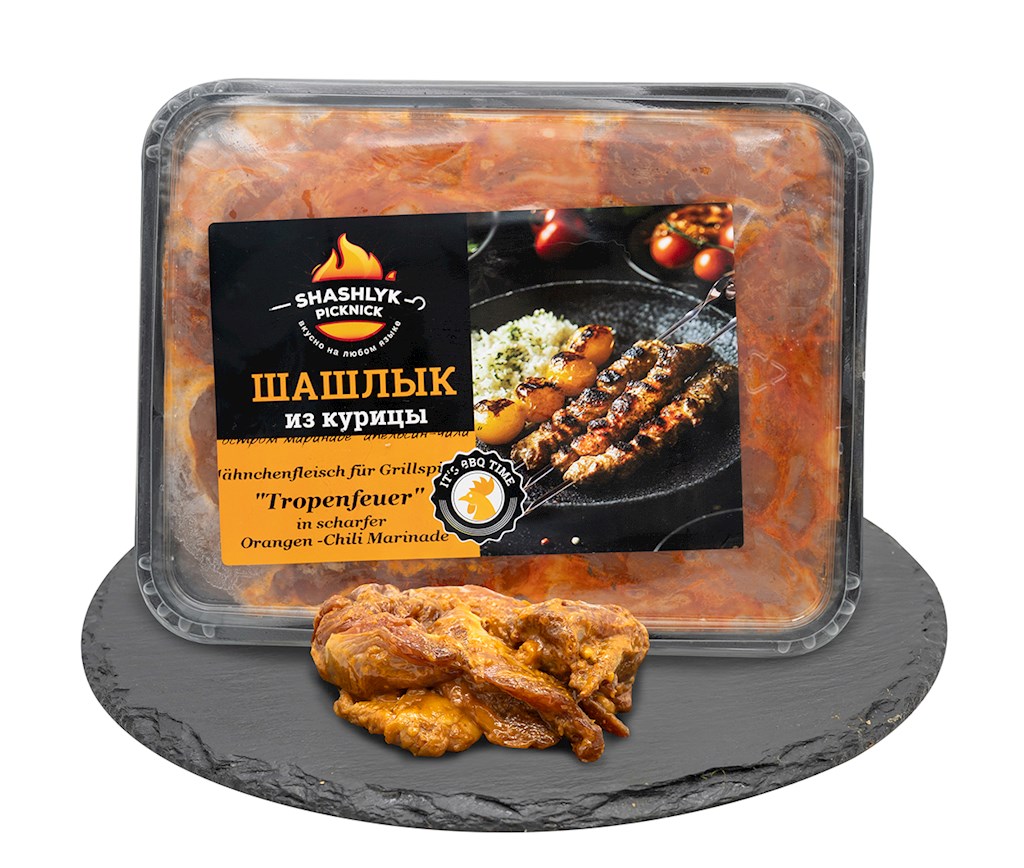 - PICKNICK Schaschlik Hähnchen "Orange/Chilli" -18° C Zutaten: Hähnchenschenkelfleisch 80%, Wasser, Sonnenblumenöl, Salz, Zucker, Essig, getrocknete Orangenschale, Knoblauch, Zwiebel, grüne Paprika, Zimt, Koriander, Bockshornklee, Muskatnuss, Paprikapulverextrakt, Säureregulator: E330, Verdickungsmittel: E415, KonservierungsmittelE202, Farbstoff:E160a. Zubereitung: auftauen lassen, aufspießen und über Grillstelle grillen. Nach Geschmack mit marinierten Zwiebeln, Soßen oder Brot servieren. Durchschn. Nährwerte je 100g: Brennwert 690 kj/ 165 kcal, Fett 9,5 , davon gesättigte Fettsäuren 2,3 g; Kohlenhydrate 2,5 g, davon Zucker 1,8 g, Eiweiß 18 g, Salz 1,4 g.